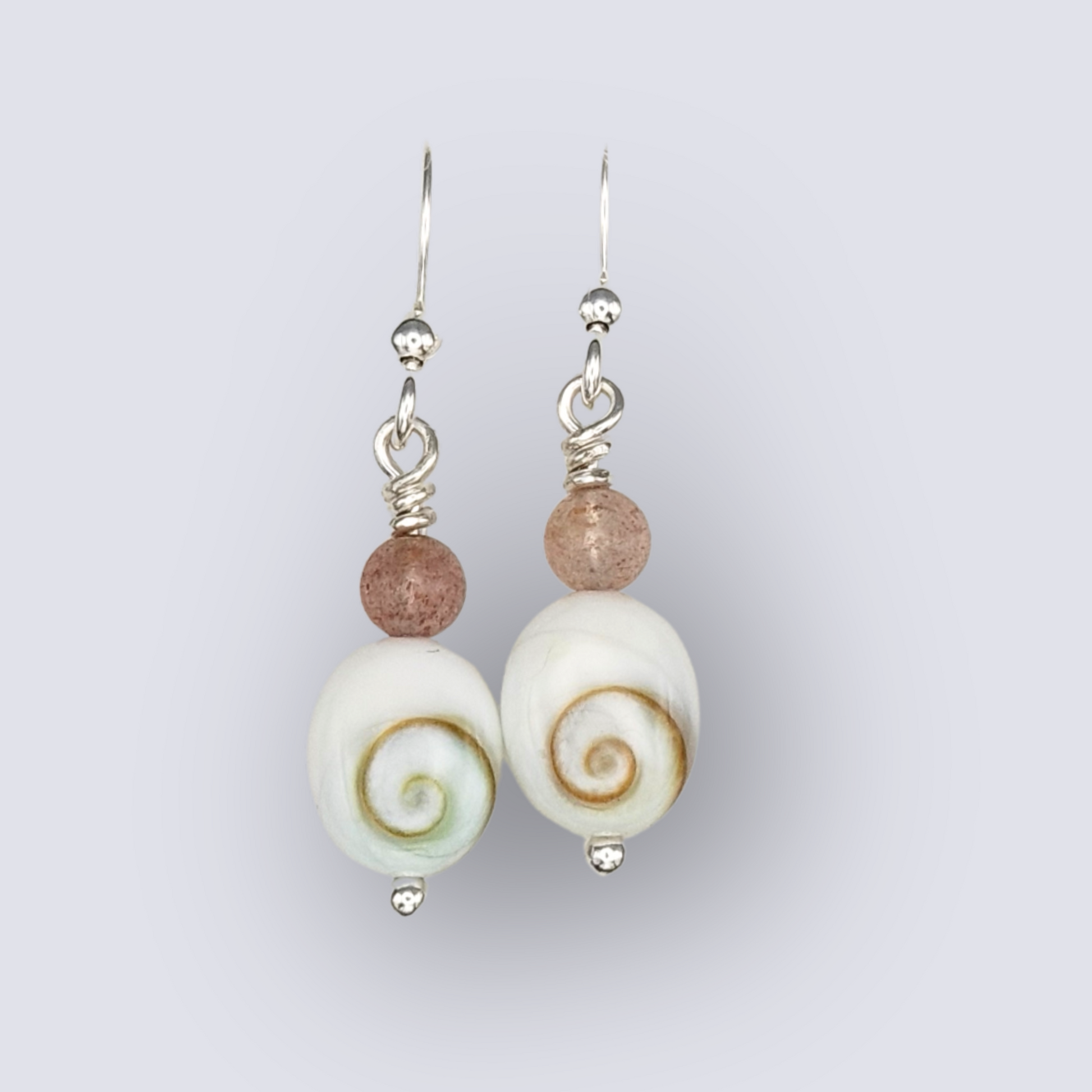 Heart of the Ocean – Strawberry Quartz, Shiva Shell & Silver Earrings